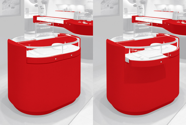 楕円に近い有機的なフォルムのアイランド型ショーケースは、側面もすべてコーリアン®︎で製作。