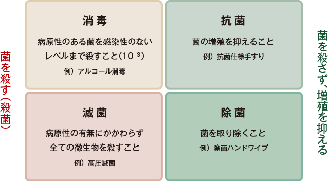 殺菌と抗菌、どちらもよく耳にする言葉ですが、その意味は少し違います。「殺菌」は菌を殺すこと。消毒や滅菌は殺菌に分類されます。対して「抗菌」は菌を殺さず、増殖を抑えること。抗菌作用のある物質を素材に練り込んだり、化学反応で結合させたりして抗菌素材を作ります。