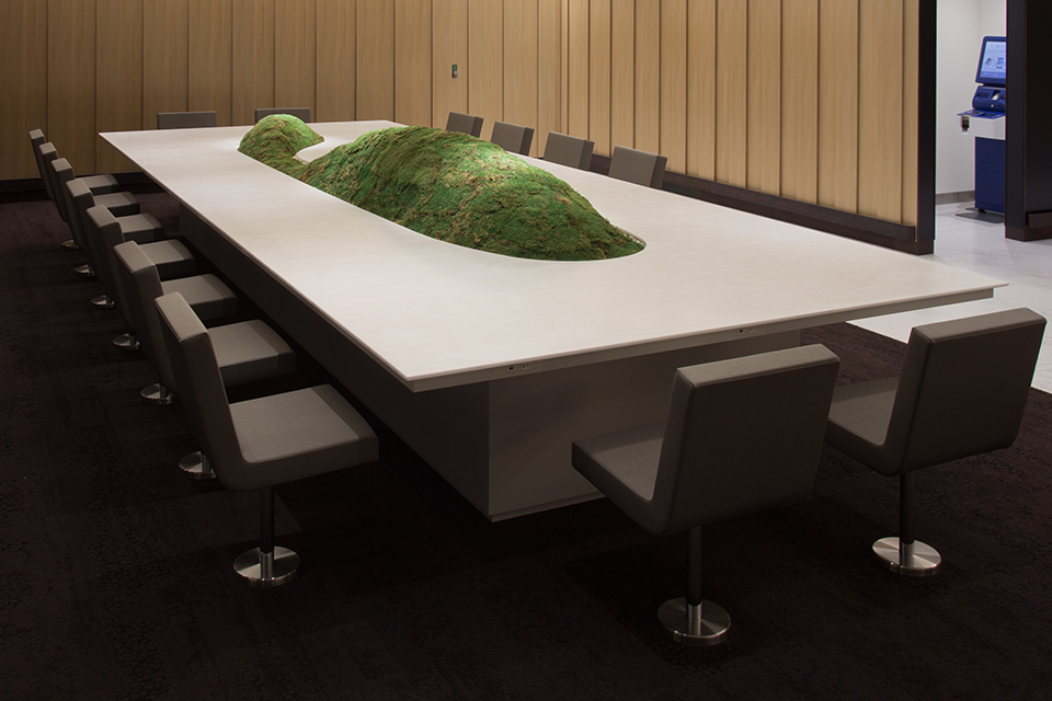 隈研吾氏監修による新千歳空港 ANAラウンジ内では、カウンターテーブルやコンシェルジュカウンターをはじめ、さまざまな場所にコーリアン®が採用されている。「空港という場所でのハードユースに耐えられる素材でありながら、たとえば輪染みがつかないこと、汚れを拭き取りやすいこと、削れにくいことなど機能面の条件をクリアする素材は、コーリアン®のほかになかなかみつかりません」と設計担当者は語る。