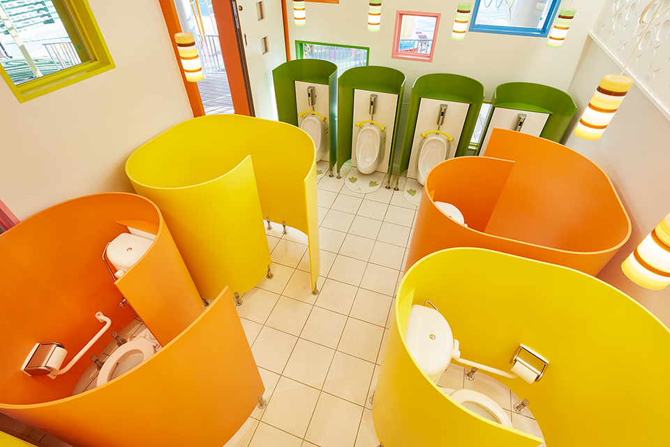 師勝幼稚園のリノベーション計画で手がけたトイレに、カラフルなコーリアン®がくるりと渦を巻くユニークでかわいらしいトイレブースがデザインされている。年少クラスでは、トイレトレーニングを行っているが、扉のないブースは子どもにとって入りやすく、先生の介助もスムーズにできるそう。コーリアン®は汚れがつきにくく、お手入れがしやすいと先生方にも好評だ。