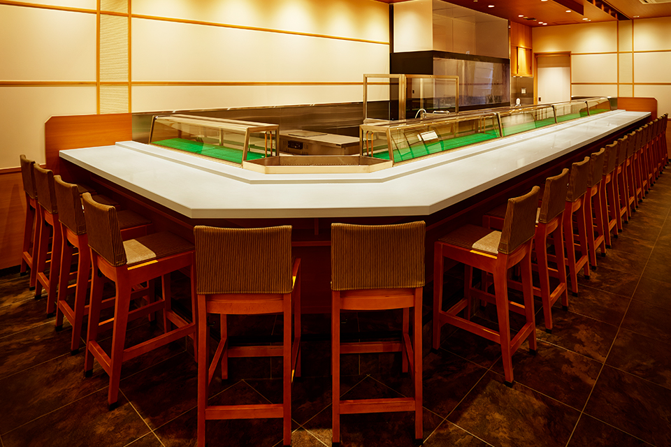 板場を囲むように配置された長いカウンターはコーリアン®製。「以前は、寿し店らしい檜のカウンターにこだわっていたのですが、年数がたつと傷が目立ってしまいメンテナンスが大変。天然石のカウンターを使用したこともありますが、こちらは目地に汚れがたまるなどの問題が。その点、コーリアン®は手入れが簡単で、扱いに気を使わなくてよいので、現場のスタッフから好評です」とのこと。