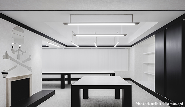 たとえば、アパレルブランドの世界観をオフィス空間に表現した「mastermind JAPAN」のヘッドオフィスでは、白と黒と光のみというミニマルな要素を用いて、空間の凸凹を消す(=感じさせない)デザインにすることで、奥行き、長さ、幅、重さのすべてが曖昧になった二次元のような空間をつくりあげています。ここでは、コーリアン®も厚みや重さを感じさせないディテールに仕上げられています。