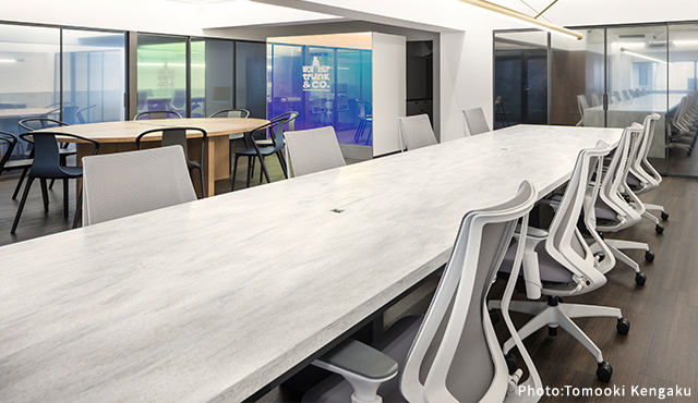 mastermind JAPANの例とは対照的に、コーリアン®️の存在感を強調するように使っているのが、トラベルエージェンシー「wondertrunk & co.」のオフィス。フリーアドレスのオフィス空間に置かれた長さ9mのワークテーブルはコーリアン®️アロールートで製作されています。